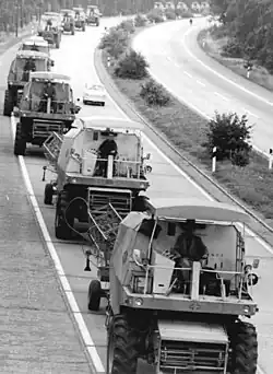 In 1985, East German agriculture employed 10.8 percent of the labor force, received 7.4 percent of gross capital investments, and contributed 8.1 percent to the country's net product.[2] Farms were usually organized either in state-owned farms ("Volkseigenes Gut") or collective farms ("Landwirtschaftliche Produktionsgenossenschaften").