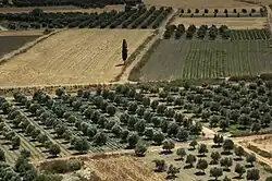 Greek agriculture is based on small, family-owned dispersed units. Currently, 47,9% of agricultural land is arable land, 27,4% is composed of tree plantations, 2,1% is composed of vines and 22,4% is composed of other cultivations (mostly used as pasture land).[1] Greek agriculture employs 615,000 farmers, 12,4% of the total labor force.[2] It produces more than 4,2% of the national GDP,[1] occupies 2.824.449 hectares of land and is the main source of occupation for the majority of rural areas in the country.