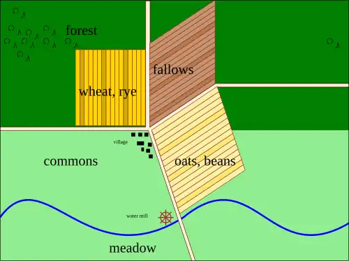 A three-field pattern was typical of the later Middle Ages in northern Europe with its wetter climate. One field was planted in autumn, one field was planted in spring, and the third field was left fallow. Crops were rotated from year to year and field to field. Thus, cultivation was more intensive than it was under the two-field pattern. In both patterns, common areas of wood and pasture as well as fallowed fields were used for communal grazing and wood-gathering.[32]