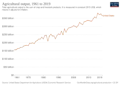 Farm productivity increased in the United States from the mid-20th century until the late-20th century when productivity began to stall.[13]