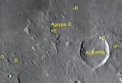 By convention these features are identified on lunar maps by placing the letter on the side of the crater midpoint that is closest to Agrippa.[4] Agrippa B is to the north, Agrippa D and G are further west, Agrippa E is nearly northwest which is attached to another satellite crater Agrippa S, Agrippa F is not far to the east and Agrippa H is north-northeast touching the main crater.