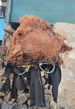 The frame of the hat is fine cane usually in red colour with red goats' hair and hornbill feathers on top frequently with a chain of tigers' claws that hangs around the chin.[3] Some are decorated with double transparent flat horns on both sides.[4] These are made from mithan's horn.[5]