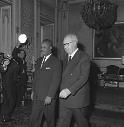 In 1946, Ahidjo entered territorial politics. From 1953 to 1957, Ahidjo was a member of the Assembly of the French Union.[5] From 28 January 1957, to 10 May 1957, Ahidjo served as President of the Legislative Assembly of Cameroon.[11] In the same year he became Deputy Prime Minister in de facto head of state André-Marie Mbida's government. In February 1958, Ahidjo became Prime Minister at the age of thirty-four after Mbida resigned.[5] He was reassuring towards the Church and the Muslim aristocracies in the north of the country and succeeded in embodying the union of conservative currents concerned about the growing number of protest movements in the 1950s. While serving as Prime Minister, Ahidjo had administrative goals to move toward independence for Cameroon while reuniting the separated factions of the country and cooperating with French colonial powers. On 12 June, with a motion from the National Assembly, Ahidjo became involved in negotiations with France in Paris. These negotiations continued through October, resulting in formal recognition of Cameroonian plans for independence.[12] The date for the simultaneous termination of French trusteeship and Cameroonian independence was set by Cameroon's National Assembly for 1 January 1960.[13][12] During and immediately after Cameroon was decolonized, Ahidjo recruited follow northern, Muslim Fulani and Peuhl into the army and an elite guard.[14]