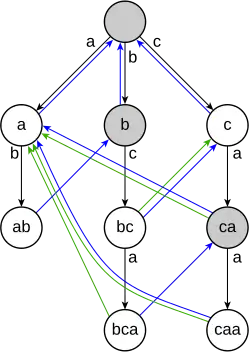 There is a green "dictionary suffix" arc from each node to the next node in the dictionary that can be reached by following blue arcs. For example, there is a green arc from (bca) to (a) because (a) is the first node in the dictionary (i.e. a blue node) that is reached when following the blue arcs to (ca) and then on to (a). The green arcs can be computed in linear time by repeatedly traversing blue arcs until a blue node is found, and memoizing this information.