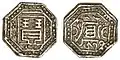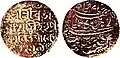Ahom coinage or Coins of Ahom Kingdom, issued from 1648 CE –1824 CE. First Ahom coin was issued by Jayadhwaj Singha (r. 1648–1663)[1] and the last Ahom king to issue coin was Jogeswar Singha (r. 1821–1824). Coins were usually struck in octagonal shape, but square and round shapes coins were also issued but in limited quantity for special occasions and trade, the obverse of the coin contained the name of the king and date of coin and the reverse contained the imprint of the deity of the concerned king.[2] The script used in coins was mainly Assamese, a few coins in Devanagari and Persian scripts were also issued. Ahom script in coins were extensively used during the war with Mughals. Chinese script was also used in order to meet out trade with Tibet, but is extremely rare.[3]