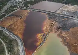 The operation has caused controversy because of its environmental impacts. Sulfate concentration in the effluent (8000 mg/m3) has exceeded the permitted levels (130 mg/m3), causing severe pollution in the water course.[43] Insufficient mixing caused the formation of an artificial halocline in a lake where effluent was discharged, which led to the lake bottom becoming anoxic.[44] Reduction of sulfate into hydrogen sulfide by bacteria caused odour problems. Also, dust emissions were reported, but the prosecutor declined to press charges after a police investigation was completed.[45][46]