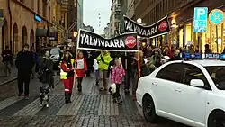 On 14 December 2012, the demonstration was organized by a citizen movement called Stop Talvivaara.[82] One of the leaders is Hannu Hyvönen, who had filmed footage on the mine's area.[83] Finnish Association for Nature Conservation and Greenpeace Nordic were invited to take part in the demonstration, and they both had a word in the citizen forum, as guests speakers of Stop Talvivaara. The demonstration took place in 14.11.2012 in Helsinki. Finnish Association for Nature Conservation reminded that the environmental law demands immediate corrective action and restoration.[84] In November 2012, Greenpeace demanded to close Talvivaara mining operations.[85] Journalists have not been permitted to enter the area to acquaint themselves with the situation. In November 2012, Finland's largest environmental NGO, the Finnish Association for Nature Conservation, called for government intervention in the matter.[86]