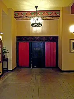 The interior design of the hotel also underwent several changes. Artist and interior designer Henry Lovins originally suggested a "Mayan revival" theme with Hispano-Moresque influences.[11] However, the husband and wife team of Arthur Upham Pope and Phyllis Ackerman was selected over Lovins.[36] Drawing on their experience as art historians, Ackerman and Pope created a style that mixed Art Deco, Native American, Middle Eastern, and Arts and Crafts styles.[41] The interior work was carried out by a number of artisans under their supervision. Much of the decoration originally used was Persian, and Ackerman and Pope would go on to become art consultants in Iran.[42]