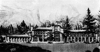 In 1925, the Park Service, unhappy with the declining concessions situation within the parks, decided to grant a monopoly to single entities to run the hotel and food services in each park. In response, the Curry Company and The Yosemite National Park Company (successor to D. J. Desmond Park Company) were merged to create one larger concessions company, with Donald Tresidder from the Curry Company as the new head. As part of this reorganization, the newly formed Yosemite Park and Curry Company proposed a new luxury hotel.[18] Given the Curry Company's enormous success in the park, it was hoped that their involvement would help realize Mather's hotel.[17] While the National Park Service technically had complete control over the park's operations, the Yosemite Park and Curry Company began to have further influence. The monopoly obtained leasing privileges and accumulated both financial and political benefits.[19] What began as a simple campsite run by two Indiana schoolteachers ended up as the sole concessionaire for the park,[20] and Yosemite Park and Curry Company went on to build much of the park's service structures.[21]