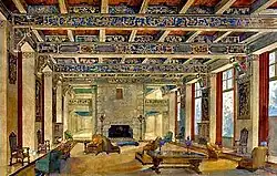 The original concept art for the hotel depicted a building that was far grander than what would eventually be constructed.[39] Underwood's original design called for a massive six story structure,[11] but Tresidder and the board requested a hotel with only 100 guest rooms that would feel more like a luxurious country home than a hotel. The design was changed several times and at one point the hotel was to be no larger than three stories high, but eventually a more expansive layout was selected to accommodate the 100 guest rooms along with several public spaces.[40]