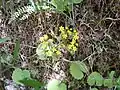 It is usually smooth and glabrous, 4 to 30 centimetres (1.6 to 11.8 in) tall and green. It has a dark green, ascending stem. Flowers are 6–10 millimetres (0.24–0.39 in) in diagonal, most with 7-petals, in dense summits. Petals are 3–5 millimetres (0.12–0.20 in), ovate, short aristated, pale golden yellow, with a central dorsal rib.[2]