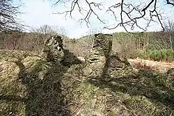 The stone castle was built on a steep promontory on a bend in the River Spey.[1] Its strategic location made it naturally defended on three sides. The only approach to the castle was via a narrow ridge to the south. There is evidence that the ridge was mined to make it steeper.[3] The castle is said to have been known for its interior oak panelling.[2]