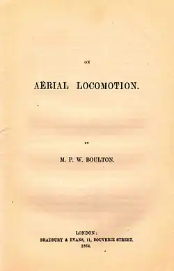 Boulton's description of his lateral flight control system was "the first record we have of appreciation of the necessity for active lateral control as distinguished from [passive lateral stability].... With this invention of Boulton's we have the birth of the present-day three torque method of airborne control" as was praised by Charles Manly.[9] This was also endorsed by C.H. Gibbs-Smith.[10][11] Boulton's British patent, No. 392 of 1868, issued about 35 years before ailerons were "reinvented" in France, became forgotten and lost from sight until after the flight control device was in general use.[12][Note 1] Gibbs-Smith stated on several occasions that if the Boulton patent had been revealed at the time of the Wright brothers' legal filings, they might not have been able to claim priority of invention for the lateral control of flying machines. The fact that the Wright brothers were able to gain a patent in 1906 did not invalidate Boulton's lost and forgotten invention.[10]
