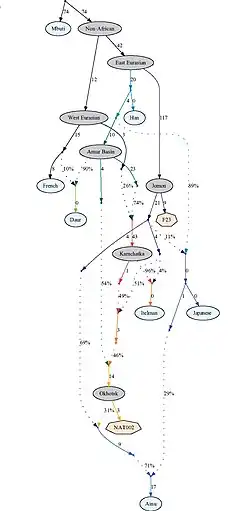Studies on modern-day Ainu estimate that they derive between 66% and 79.3% of their ancestry from the Jōmon lineage.[108][109] Another study on modern Ainu individuals found that they derive c. 49% of their ancestry directly from the Jōmon people, c. 22% from the Okhotsk people (who themselves could be modeled as 54% Ancient Northeast Asian, 22% Ancient Paleo-Siberian, and 24% Jōmon), and ~29% from the Yamato Japanese (who carried around 11% Jōmon and 89% Yayoi ancestry), corresponding with historical events.[88]