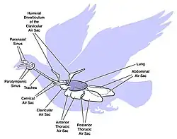 Birds have a system of air sacs in their ventilation system.[2] The air sacs work to produce a unidirectional flow where air enters and exits the lung at the same rate, contrasting the lungs of other tetrapods such as mammals where air enters and exits the lung in a tidal ventilation.[2]