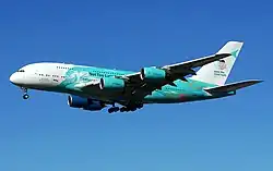 In August 2018, Air Austral began wet leasing an Airbus A380 from charter airline Hi Fly after it grounded one of its Boeing 787s due to inspections of the plane's Rolls-Royce Trent 1000 engines.[16] In October 2019, Air Austral announced it was developing its plans to renew its fleet.[17] That month, the airline signed a purchase agreement for three Airbus A220-300 aircraft that would replace its two Boeing 737-800 and ATR 72-500 aircraft.[17] The airline projects it may begin renewing its long-haul fleet beginning in 2023.[17]