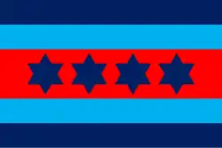 Australian air chief marshals may also fly an officer distinguishing flag. For air chief marshals this comprises five horizontal stripes which from top to bottom are coloured: dark blue, light blue, red (double thickness), light blue and dark blue with four stars imposed in a line on the red stripe.[1]