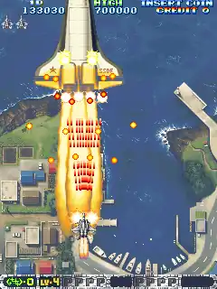 Players traverse through six automatically-scrolling stages, set in locations such as harbors, forests, and Tokyo Tower.[2][3] The objective is to make it to the end by destroying waves of enemies and avoiding projectiles.[3] Each level concludes in a boss fight against an enemy aircraft. Players can upgrade their fighter jet by collecting four matching power capsules. Weapons include a laser, a support drone, homing missiles, machine guns, and a spread shot.[3] Each weapon can be upgraded four times; should the player die, their weapon level reverts to zero.[3] Players can also pick up star-shaped medals that cycle through different point values, and two varieties of smart bombs that either clear the screen of enemies or provide a focused, narrow attack.[2][3]
