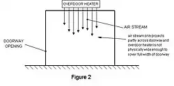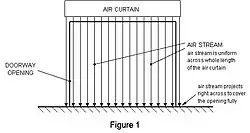 Air doors can be equipped with or without heaters to heat the air. The fan must be powerful enough to generate a jet of air that can reach the floor. There are some studies in the scientific literature that present analytical methods to predict the sealing efficiency obtained with an air curtain.[3]