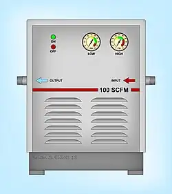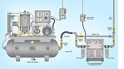 Water contamination is an inherent byproduct of compressing atmospheric air since the atmospheric air contains a large amount of water existing in the gaseous form.[1][2] Because of this phenomenon, compressed air systems usually benefit from the addition of a compressed air dryer located on the output of the air compressor and/or at various locations throughout the distribution system. In most cases, the output of the compressor is processed through a primary dryer or system dryer. In cases where higher quality air is required the output of the primary dryer is further processed through a secondary dryer or polishing dryer.