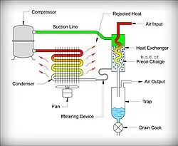 These dryers derive their cooling from a closed cycle refrigeration system based around one of three commercial refrigerants, R-22, R-134a or R410a. The refrigeration system these dryers use is similar to home and commercial air conditioning systems. The schematic shown to the right illustrates a typical Freon-based refrigerated compressed air dryer.