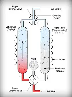 - Heatless "pressure-swing" drying, which uses part of the dry compressed air coming from the other vessel to dry the desiccant in the vessel being regenerated at lower pressure. 17-20% purge rate