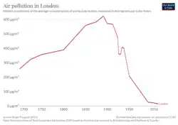 Four years after the Great London Smog, Parliament passed the Clean Air Act 1956, which made a substantial difference to urban air quality.[38] Even so, air pollution remains a serious environmental issue in the UK over half a century later.[39]