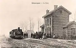 The CF du ARB remained behind Allied lines during World War I.[14] It fell within a security zone known as the Reserved Zone. Civilians living within this zone had free travel within the Canton in which they lived. To travel beyond their own Canton, or in and out of the Reserved Zone, a sauf-conduit (identity card) was required. Civilian passengers had to leave their train and go into the station building to have their papers checked when crossing Cantons. A procedure which led to complaints as some passengers missed their train when it departed whilst their papers were being checked. Military personnel had their papers checked on board the train. Services were reduced in frequency, with military and freight traffic taking priority.[15] Civilian services were reduced during the war, with further reductions inn 1917 and 1918.[16] In March and April 1918, Aire-sur-la-Lys came within shelling range of German artillery following gains made by the Germans during the Spring Offensive.[17] In late April, 296 Railway Company, Royal Engineers established a major depot at Rang-du-Fliers.[18] This included a repair facility for both standard- and metre-gauge locomotives. Aire-sur-la-Lys was bombed on 16 May, but damage to tracks was repaired within 24 hours.[19] In August, a chord was laid at Gourgesson Junction enabling trains to run directly between Aire-sur-la-Lys and Anvin without reversing.[18]