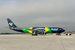 - Azul Brazilian Airlines: White aircraft with navy blue belly and tail. Several green and yellow stripes (resembling the colors of the Brazilian flag) are painted on the fuselage, tail, winglets, and engines. The logo on the tail is shaped like the map of Brazil, with each of the Brazilian states being shown as different colored geometrical forms.[2]