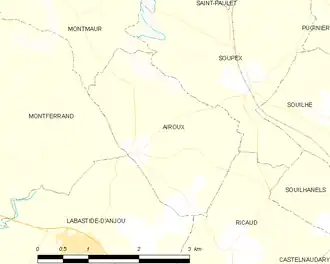 Airoux is within the urban area of Castelnaudary situated in the Lauragais on the Rigole de la plaine. It is located some 5 km north-west of Castelnaudary and 15 km south-east of Villefranche-de-Lauragais. It can be accessed on road D217 from Labastide-d'Anjou in the south through the village and continuing north-east to Soupex. There is also the D1 road from Montmaur in the northwest which also passes through the village and continues south-east to Ricaud. The commune consists entirely of farmland with no other villages or hamlets.[3]