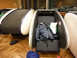 The first sleeping pod was introduced in 2013 at Helsinki Airport in Finland. The sleeping pod allowed airline travelers to relax in their own peaceful space. The pod features adjustment to be turned from a seat to a bed, a storage area for carry-on luggage, and charging connectivity.[6]