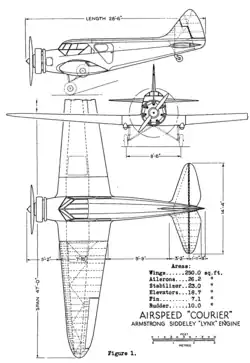 As the development effort on the Airspeed Ferry airliner was drawing to a close during 1931, company co-founder Hessell Tiltman was keen for the firm to commence another project.[1] Prior to this, Airspeed's design team has exchanged several rough ideas for a conceptual aircraft suitable for use by private owners; it was asserted that, in comparison with existing models on the market, a modern aircraft for the role ought to be more useful and spacious, with sufficient capacity to accommodate five or six people at a time. Early drafts of what would become the Courier were produced and presented by Tiltman to Airspeed's board, who gave their authorisation for further work during November 1931.[1]