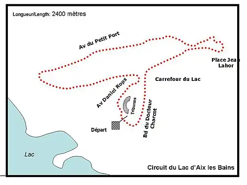 The Circuit du Lac d'Aix-les-Bains (the lake race track) was in and nearby the Lac du Bourget next to the French commune of Aix-les-Bains. Its length, 2,400 m (1.5 mi), was typical of city race tracks.[1][2] A slightly different track was reported to be in use in 1953.[3] It was the sole race track in Savoie - the nearest others were Geneva's Circuit des Nations, Lausanne's Circuit du Léman, and at Lyon. Many drivers and spectators attended from neighboring Switzerland and Italy, and even from the UK.