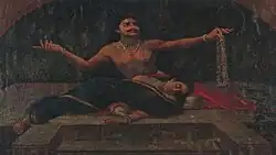 Indumati used to be an apsara, a celestial damsel named Harini, in her previous birth. Once, Indra grew apprehensive of the rigorous penance practiced by the sage Trinabindu, and sent her against him for disrupting his penance. By exhibiting in front of him her attractive form, she succeeded in interrupting his penance. As a result, the enraged sage cursed her to be born as a mortal woman on earth, and remain there till she beholds celestial flower on the earth. In due course, she was born as a princess of Vidarbha, and chose king Aja as her husband during her svayamvara.[5] Soon, Dasharatha was born to them. However, her time on earth soon came to its end. Once, while sage Narada was traversing the sky, a garland of his veena fell on Indumati, redeeming her from the curse. Regaining the form of an apsara, she vanished from the earth, leaving Aja behind. King Dasharatha was only eight months old when Indumati died.[6]