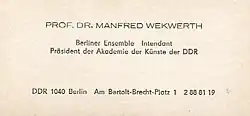 In April 1974, it received the designation Akademie der Künste der Deutschen Demokratischen Republik (AdK, Academy of Arts of the German Democratic Republic).[1] The AdK "helps with the development and dissemination of a partisan and popular art of socialist realism, which contributes to the formation of socialist personalities, an art which enriches the spiritual life of the people and acts as a component of the culturally rich way of life under socialism. It makes an important contribution to the research, cultivation, development and dissemination of the cultural and artistic heritage." (Statute of the AdK of the GDR of 26 January 1978)