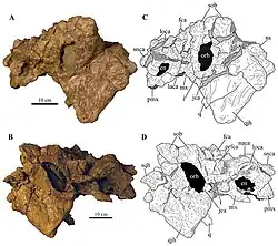 An almost complete skeleton of an ankylosaurid was excavated during the 2008, 2009, and 2010 field seasons from the Horse Mountain Gryposaur (HMG) Quarry in the Grand Staircase–Escalante National Monument, Kane County, Utah.[1] The Horse Mountain Gryposaur Quarry represents a multitaxic and multidominant bonebed that has produced a mostly complete, partially articulated skeleton of the hadrosaurid Gryposaurus, the holotype of the baenid turtle Arvinachelys, an articulated skeleton of a small alligatoroid, and a partial skull of a small theropod. The bonebed is deposited in a fine- to medium-grained sandstone crevasse splay that is located within the lower section of the middle unit of the Kaiparowits Formation. The age of the layer is 76.26 ± 0.10 million years based on zircon dating. In 2014, the skull was subjected to a CT scan in order to reveal the internal anatomy. The specimen was subsequently described in 2018 by Jelle P. Wiersma and Randall B. Irmis.[2]