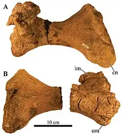 The scapulae are curved outward towards the sides and curve inwards towards the middle. The acromion process of the scapula is positioned directly above the glenoid fossa and projects exactly upright to the side surfaces of the scapular blade. The scapular blade has a distinct surface on the ventral surface that would have supported the muscle M. triceps longus caudalis. The scapular blade is paddle-shaped with a convex distal margin in side view. The coracoid is square in shape and is fused to the right scapula. The humerus has an enlarged deltopectoral crest which is soon followed by a thick humeral shaft. A large projecting process is present towards the back and underside of the humeral head, which is present in some other ankylosaurids but are expressed to a lesser extent. On the side of the deltopectoral crest is large yet round protuberance which forms the articulation surface for the muscle M. latissimus dorsi. The only remains of the left ulna is the olecranon process and a partial shaft with the radial notch morphology being similar to that of other ankylosaurs. Towards the side margins, the ilium is concave and nearly straight towards the middle. Towards the middle of the ilium is a concave sulcus which forms a closed acetabulum. As with other ankylosaurids, the right ischium is Y-shaped towards the sides and in medial view, and consists of a shaft that is compressed towards the sides with no anterior curvature. A small protuberance on the dorsal surface is formed between the femoral head and the greater trochanter. In Akainacephalus and all other Late Cretaceous Laramidian ankylosaurids, the femoral head is oriented horizontally. Although the fibula is very poor as it experienced severe breakage and surface weathering, it was long and narrow. The pedal phalanx is transversely wider than long. In addition, the pedal phalanx is concave along the front and back articular surfaces.[2]