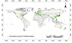 Akebia quinata is native to China, Japan (all major islands except Hokkaido[2]) and the Korean peninsula,[23] but is cultivated globally. This map represents sightings of both wild and cultivated plants.