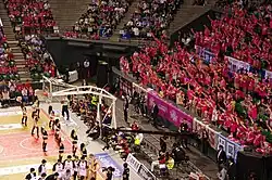 The Happinets fans are widely known as "Crazy Pink" and sometimes have overwhelming numbers at the visitors games.[37][38][39] The hoop-crazed fans light up arena with "Bigabiga", pink glow sticks and sing the prefectural anthem before the game.[40] The Happinets home court rocks with another stadium anthem "Fly Again" by Man with a Mission, and CNA Arena Akita is one of the hottest and loudest basketball venues in Asia.[41][42][43] The Akita Airport limousine buses have the painted images of the Happinets and Blaublitz Akita.[44]
