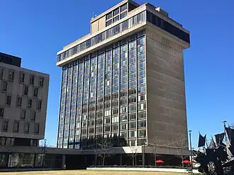 Two lower floors of the building are part of the five-level underground Cascade Parking Garage, which opened in 1968. The hotel cost $6.6 million (equivalent to $51.2 million in 2024),[2] constructed by the Ruhlin Construction Co. for a Columbus-based developer. During its construction, the nearby Mayflower Hotel closed, in May 1971, knowing the older hotel could not compete with the new structure. In 1991, the building lost its Holiday Inn franchise and became the Cascade Plaza Hotel. In 1993, a partnership purchased the building, and in 1996 it opened as the Ramada Plaza Hotel, after a total renovation. In 1998, it became the Radisson Hotel Akron City Centre. After another decade, it became the Akron City Center Hotel. The hotel closed in the winter of 2016–2017, and its contents were liquidated. A developer proposed converting the building to become residential around 2018, but the COVID-19 pandemic affected the plans. As of 2024, the building sits vacant.[1]