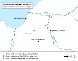 Other contemporary researchers, including Mebarek El-Mili, Mokhtar Hassani, Mahdi El-Bouabdelli, and Abderrahmane Djilali, suggest locating Al-Bathaʾ in the current municipality of El Matmar.[1] Salma Kasbadji proposes that the location of Al-Batha', according to historical accounts, could be near the locality of Bou-Guirat.[3]