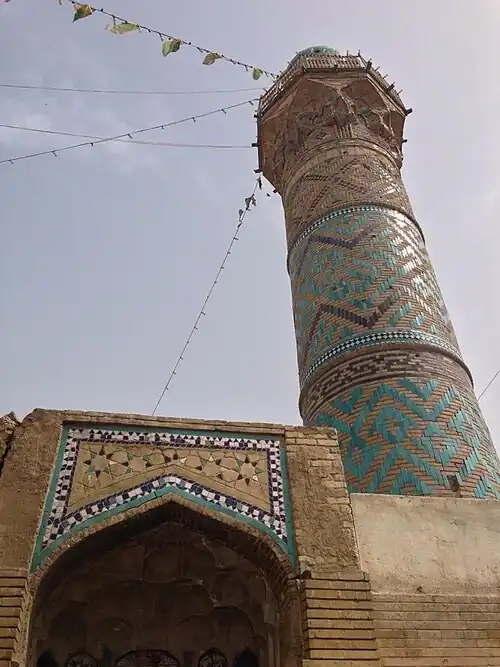 The mosque is made of bricks and includes a minaret and a dome which is built on a cylindrical body on top of the tomb of Sheikh al-Kawaz. The minaret of the mosque is located on a square base of stone. The base is approximately 5 metres (16 ft) tall with the cylindrical body of the minaret is built with bricks and stucco and is approximately 10 metres (33 ft) long. A basin is located on it which tops various muqarnas. The body of the minaret is decorated with various panels consisting of Kufic inscriptions and arranged in proportions by the wavy black brick border. The letters of the Kufic inscriptions, which includes the name "Allah", are written using glazed bricks in light blue livery.[4]