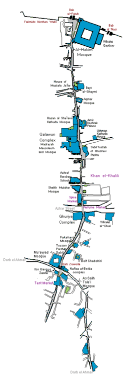 Al-Muizz street runs from the city gate of Bab al-Futuh in the north to the gate of Bab Zuweila in the south, both entrances in the stone walls built by the vizier Badr al-Jamali in the 11th century.[1] This makes it one of the longest streets in the walled city, at approximately one kilometer long. Although the name al-Muizz street generally applies only to the street within the historic walled city, in practice the road begun by al-Muizz street continues (under various names) further south for a few kilometers, passing through the Qasaba of Radwan Bey (al-Khayamiya street), and finally ending at the great Qarafa necropolis (the Southern Cemetery or City of the Dead).[2]
