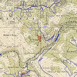 The 'Ain el-Haniya spring (also spelled Ein Haniya or Hanniya) in the Rephaim Valley, located on village lands, but separated from it by the West Bank barrier, flows from among the ruins of a Roman nymphaeum and boasts a number of archaeological remains. It has historically been used as a source of water for people and flocks, for irrigation and for recreation. Once restoration and development work was completed in 2018, the site was reopened as part of the Refa'im Valley Park, but only Israelis were allowed access to it.[38][39][40] A Christian tradition places here the baptism of the royal Ethiopian treasurer by the deacon Philip, known as the Evangelist, and the ruins of a Byzantine church are standing next to the spring.[39]