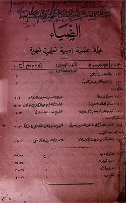Al-Ziya (Arabic: الضياء) was the first monthly Arabic magazine published by Darul Uloom Nadwatul Ulama in May 1932 under the editorship of Masud Alam Nadwi, with advisorship from Sulaiman Nadvi and Taqi-ud-Din al-Hilali, and with Abul Hasan Ali Hasani Nadwi as part of the editorial team. It was printed using lithography and released mid-month according to the Islamic calendar, focusing on literary, educational, and social topics.[1] Despite being the only Arabic magazine in India at the time and receiving widespread acclaim for developing intellectual discourse in Arab and Islamic circles, it ceased publication after four years due to financial constraints. Its legacy, however, influenced the emergence of other Arabic magazines, with Al-Baas El-Islami regarded as its successor.[2]