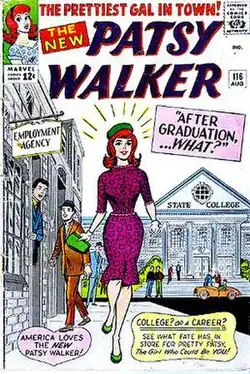 As Timely segued into Atlas Comics, Marvel's 1950s predecessor, Hartley made his mark with a more than decade-long run on the Patsy Walker teen-girl titles. With writer-editor Lee, Hartley chronicled the redheaded high schooler's lightly comic adventures in her namesake series (which ran through 1964) and in its spin-offs, Patsy and Hedy (which ran through 1967) and the single-issue A Date with Patsy (Sept. 1957). Well into the Marvel era, Hartley also drew the "Special Queen Size Annual" publication Patsy Walker's Fashion Parade #1 (1966).[10] Walker eventually would be integrated into mainstream Marvel Universe continuity in the 1970s as the supernatural superheroine Hellcat, long after Hartley had left the character.