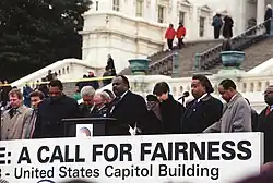 On August 28, 2017, the fifty-fourth anniversary of the March on Washington at which Martin Luther King Jr. gave his "I Have a Dream" speech, Sharpton organized the Ministers March for Justice, promising to bring a thousand members of the clergy to Washington, D.C., to deliver a "unified moral rebuke" to President Donald Trump.[78] Several thousand religious leaders were present, including Christians, Jews, Muslims, and Sikhs.[79] Washington Post columnist Dana Milbank wrote that "President Trump has united us, after all. He brought together the Rev. Al Sharpton and the Jews."[80]