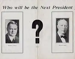 Reporter Frederick William Wile made the oft-repeated observation that Smith was defeated by "the three P's: Prohibition, Prejudice and Prosperity".[12] The Republican Party was still benefiting from an economic boom, as well as a failure to reapportion Congress and the electoral college following the 1920 census, which had registered a 15 percent increase in the urban population. Smith's economic conservatism and anti-prohibition stance likely contributed to his inability to coalesce support amongst rural progressives.[13] Smith's opponent, Republican nominee Herbert Hoover, was vastly popular. Additionally, Hoover was running on the record of an immensely popular incumbent Republican president, Calvin Coolidge.[6] Hoover benefited incredibly from the perception of Republican-led economic prosperity, which, less than a year later, would be proven to have been an illusion.[2]