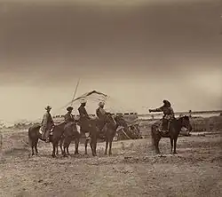 In one model of bride kidnapping present in Kyrgyzstan, the young man decides he wishes to marry and asks his parents to pick him out a suitable bride, or is told by his parents that it is time he settled down and that they have found someone of the right background and attributes. (In this sense, it may be similar to an arranged marriage, although the arranging is all on one side.) The prospective groom and his male relatives or friends or both abduct the girl (in the old nomadic days, on horseback; now often by car) and take her to the family home. Once there, the man's relatives may attempt to convince the woman to accept the marriage, and to place a white wedding scarf (jooluk) on her head to symbolize her agreement.[23] They may do this by pointing out the advantages of the union, such as the wealth of their smallholding, to show her what she would gain by joining their family. Families may use force or threaten to curse the woman if she leaves, an effective threat in a superstitious country.[24] Some families will keep the girl hostage for several days to break her will. Others will let her go if she remains defiant; she may, for example, refuse to sit down or to eat, as a sign that she is refusing the proffered hospitality. During this period, the groom typically does not see the bride until she has agreed to marry or at least has agreed to stay. The kidnapped woman's family may also become involved, either urging the woman to stay (particularly if the marriage is believed socially acceptable or advantageous for the prospective bride and her family), or opposing the marriage on various grounds and helping to liberate the woman.[25]
