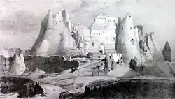 ![]() 1848 etching of Varamin by Jules Laurens, showing the tower, far right | |